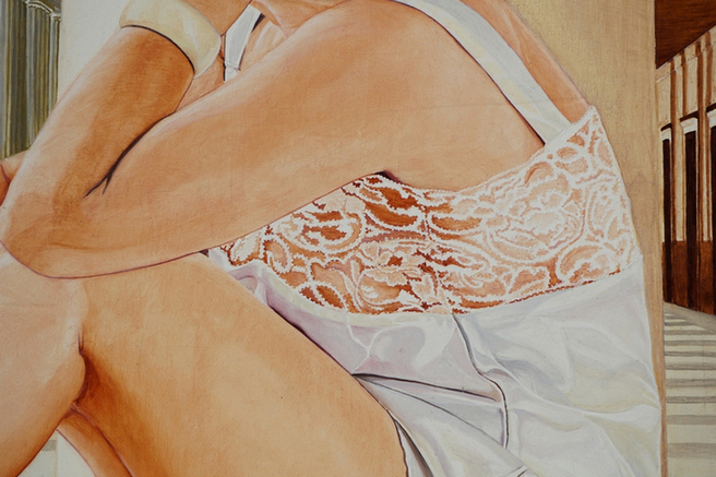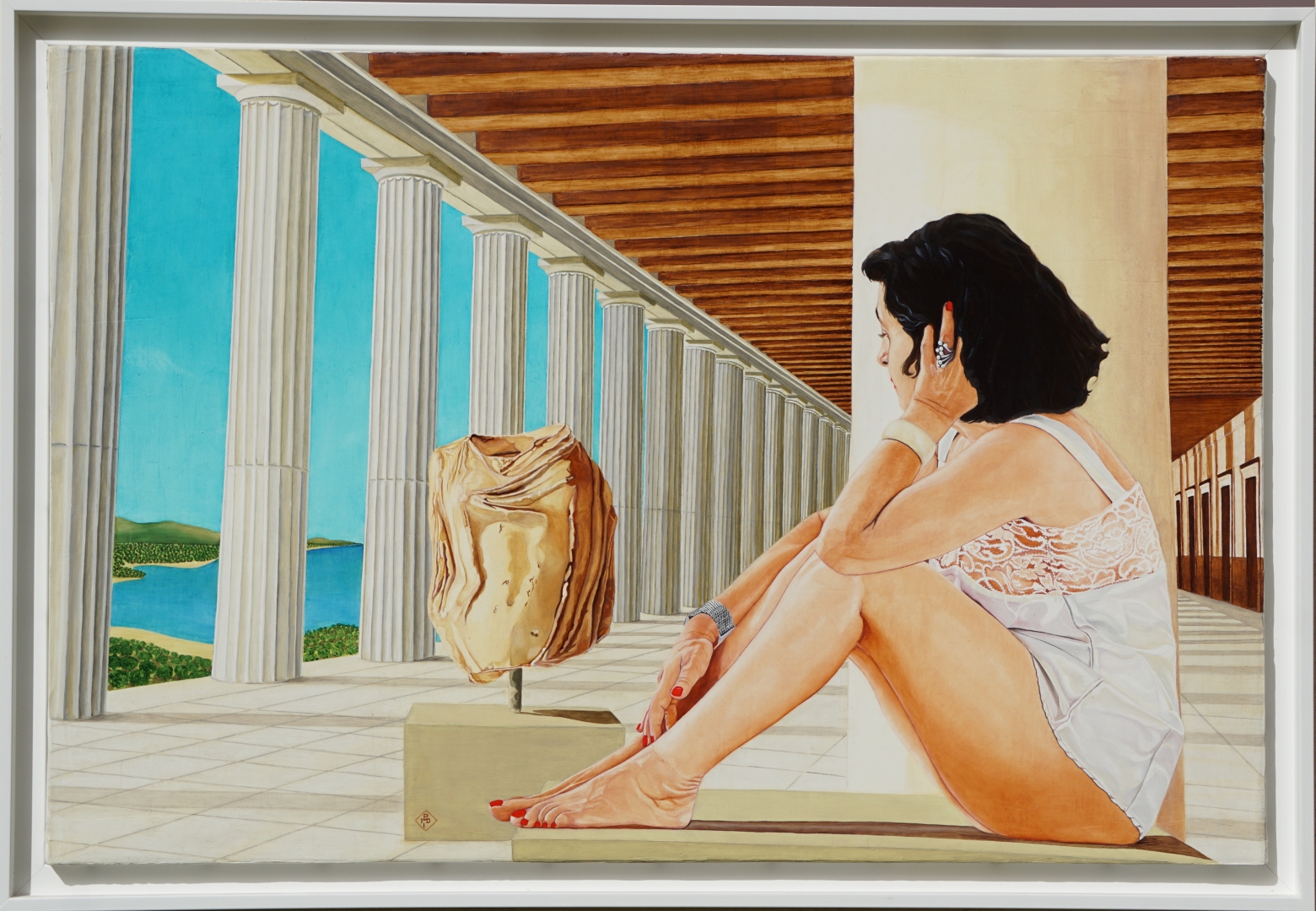 — le portique — des philosophes. Telle Aspasie, compagne de Périclès et maîtresse de Socrate en rhétorique, célèbre tant par sa beauté que par son esprit, notre modèle contemple un buste tronqué d’Aphrodite, où le temps, « ce grand sculpteur » (Hugo, puis Yourcenar), a déjà commencé son œuvre destructrice. Mais il en faut plus à une âme stoïcienne pour se laisser ronger par l’angoisse.